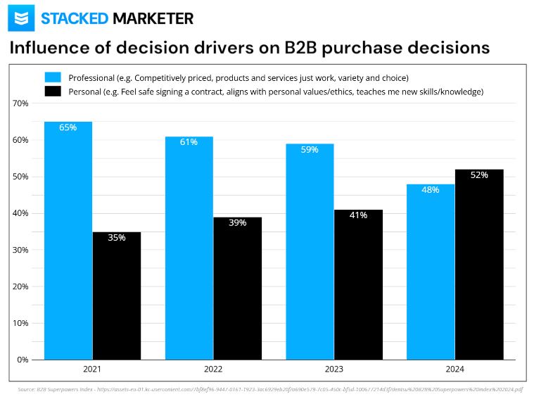 You may think B2B purchasing is done based on facts and data. But the trend over the past four years, according to Stacked Marketer, has been a significant uptick of purchasing based on feelings, such as choosing the security of dealing with a reliable vendor, or working with a company that shares the same values and ethics.